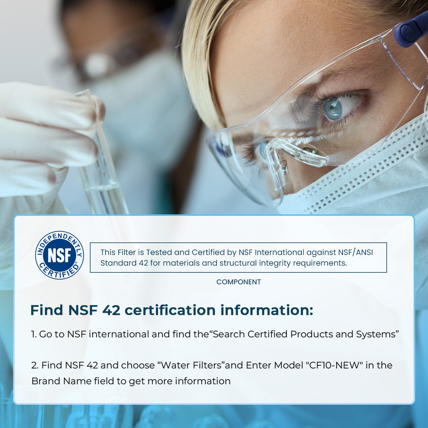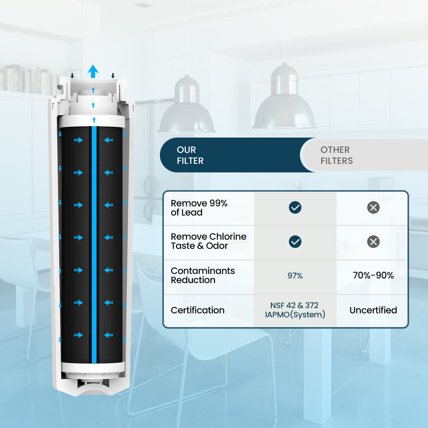 NSF/ANSI 42: Tested by our independent laboratory, this product effectively reduces 97.9% of chlorine, odors, lead, and unpleasant tastes in the water.